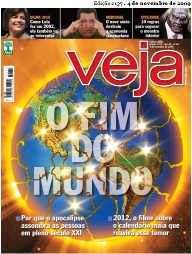 O Fim do Mundo foi a manchete estampada na capa da Revista Veja desta semana, até aí, nada de novo, ultimamente existem muitas teorias orbitando em torno do ano de 2012, como as profecias maias. Aproveitando a tal data que anda em evidência, a indústria cinematográfica não poderia deixar de lucrar com o tema que vem mexendo com o imaginário de muitos e está prestes a estreiar o filme “2012″. A Revista Veja para não ficar atrás, colocou também o fim do mundo como capa e destaque na edição desta semana.