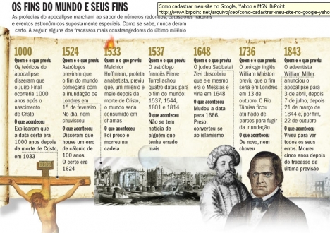 “Ano 1843: O adventista William Miller anunciou o Apocalipse para 3 de abril, depois para 7 de julho, depois 21 de março de 1844 e por fim 22 de outubro. O que aconteceu? Viveu para ver todos os seus erros. Morreu 5 anos depois do fracasso da última previsão”.